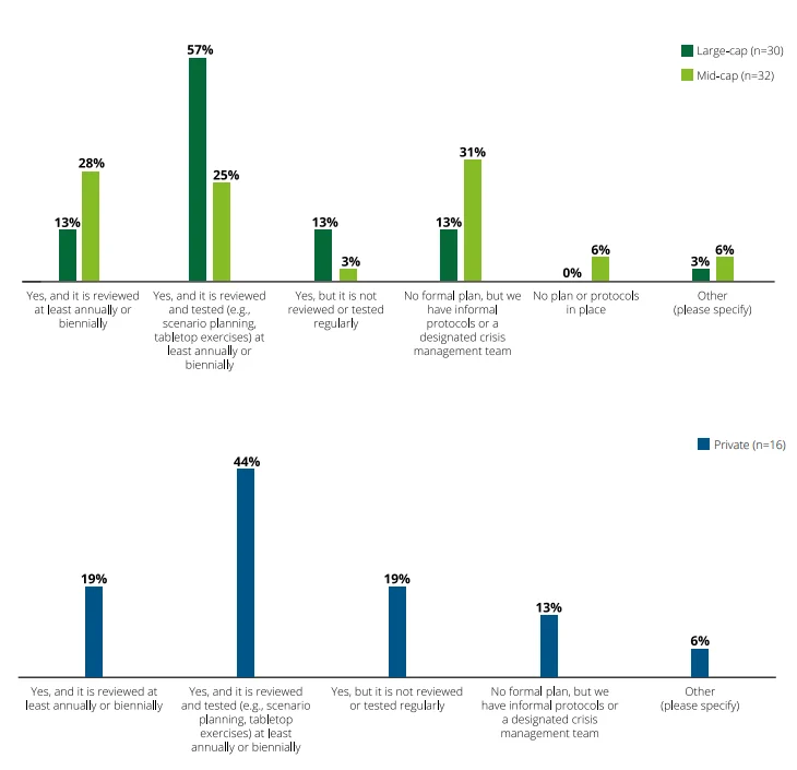 - Formalized Plans: A strong majority of private companies (82%) have formalized plans, with 44% reviewing and testing them annually or biennially. Notably, no private company respondent indicated having no plan or protocols in place.